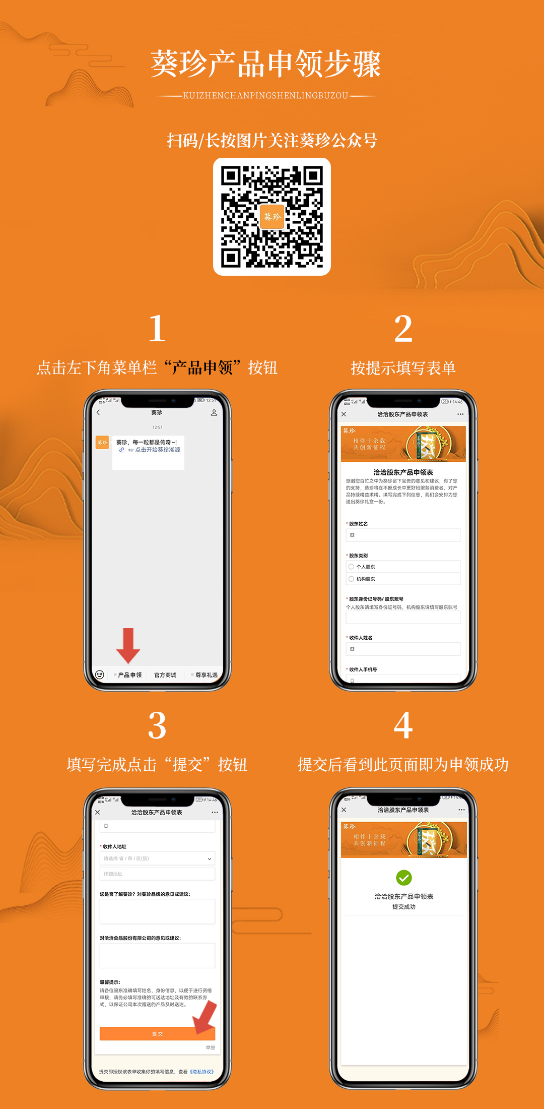 公司股东可于2022年5月21日起,通过关注公司“葵珍”微信公众号,点击“产品申领”进入申领页面,填写并提交产品申领单。