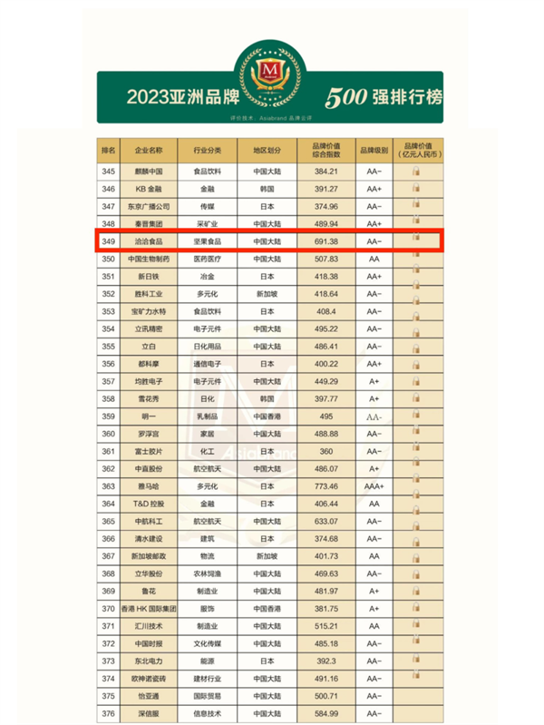 Asiabrand(亚洲品牌研究院)成立于香港,是亚洲地区最权威的品牌学术研究与品牌价值测评机构,国际上享有良好的口碑和公信力。该院从八大维度:企业信誉度,品牌文化承载性,质量和服务水平,创新引领性,品牌稳定度,品牌领导力,客户关系强度,法律保护度+品牌收益,开展品牌价值的调研和测评。在2023亚洲品牌评选中,大奖国际食品股份有限公司(以下简称“大奖国际”)成功上榜,以468.68亿的品牌价值,荣获“2023亚洲品牌500强”第349名。
