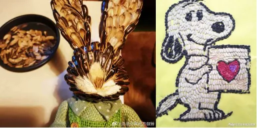 还有人随手嗑出了各种动物,小灰兔、史努比也不在话下,双手一定是被上帝吻过了吧。果然高手在民间,人人都是艺术家,感觉自己都不配嗑瓜子了。