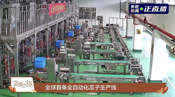 据大奖国际首席增长官王斌介绍,大奖国际瓜子自动化包装车间总投资近1.2亿,占地面积近12000平方。整体分为上下两层,分别进行制造和包装,这条集煮制、干燥、烘烤、冷却、精选、内包、外包于一体的生产线,不仅是大奖国际自主研发的全球第一条全自动瓜子生产线,更是中国炒货行业自动化水平最高的代表作。